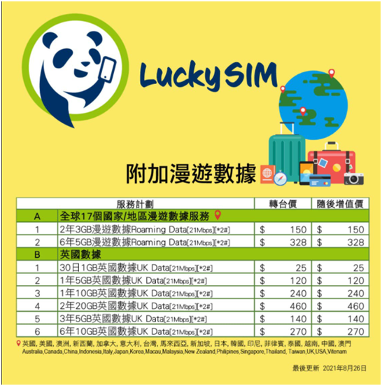 | 最平費用 | HK$50/1GB | HK$140 / 5GB英國用 | HK$30 / 100MB |
